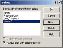 To use this feature, choose Profiles from the File menu. A list of the currently-defined profiles is shown; by default, only the profile called MAIN is defined. (The MAIN profile cannot be deleted or re-named).