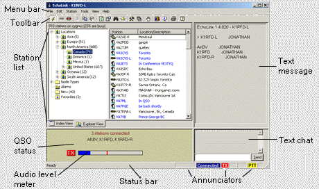 The diagram below shows the key parts of the EchoLink screen. A description of each part of the screen follows.